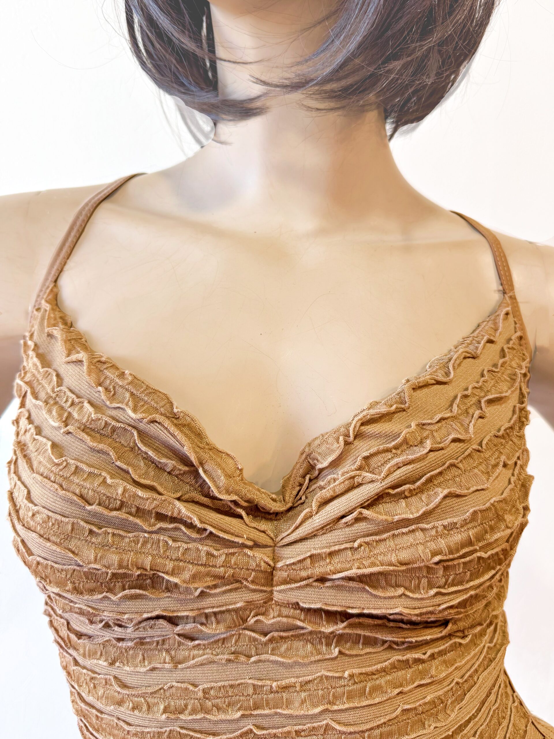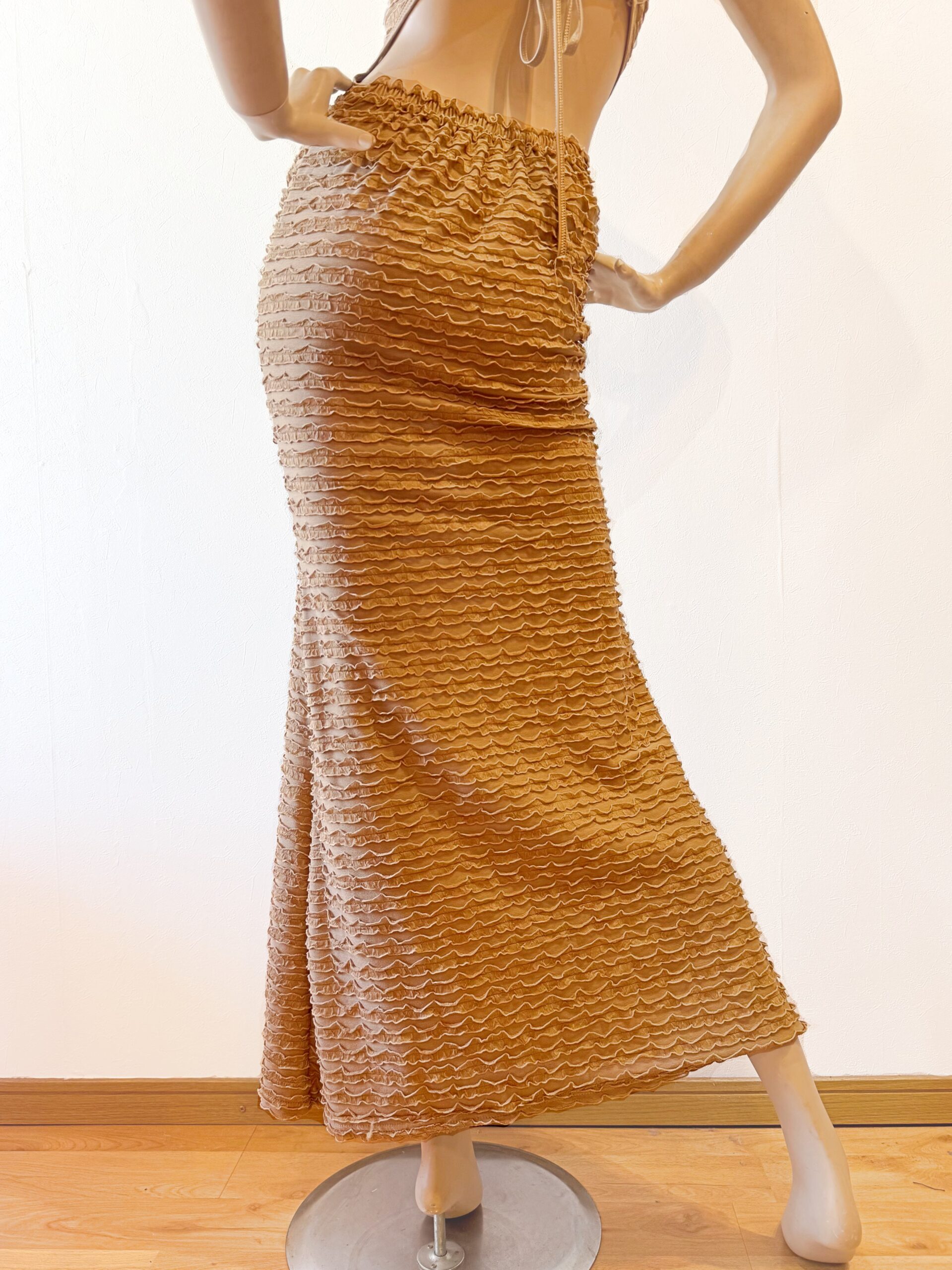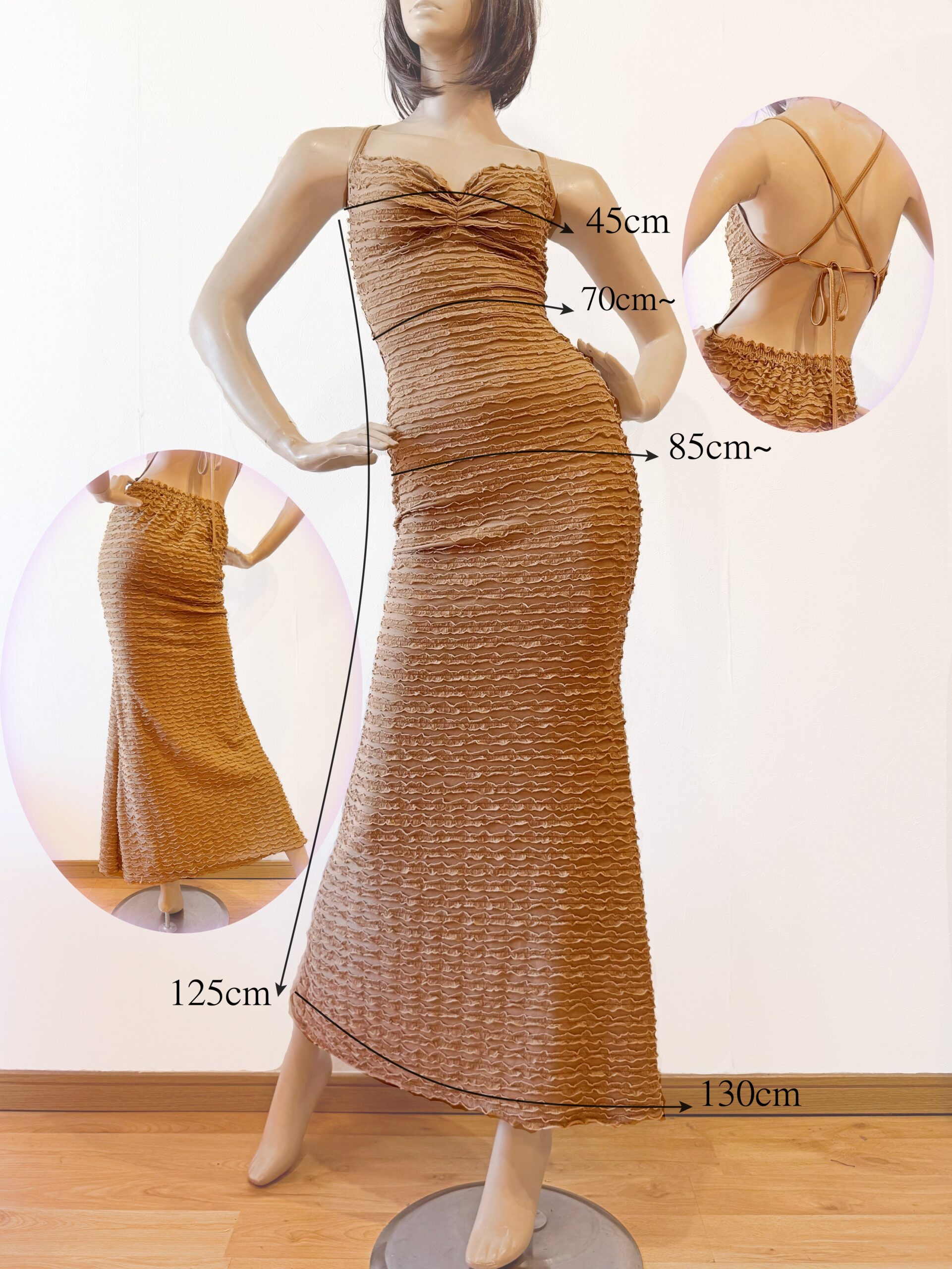 シャーリング加工が魅力のセクシーなロングドレス。伸縮性のあるストレッチ素材で体にフィットし、美しいシルエットを演出します。調節可能なストラップ付きで着心地も快適。パーティーや特別なシーンにおすすめの一着です。