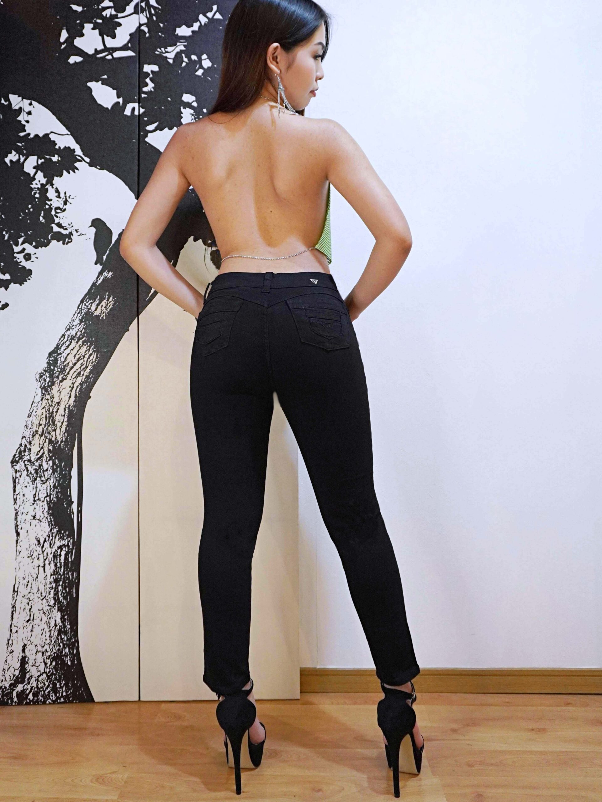 美しいヒップラインを演出するブラックスキニーデニム。
