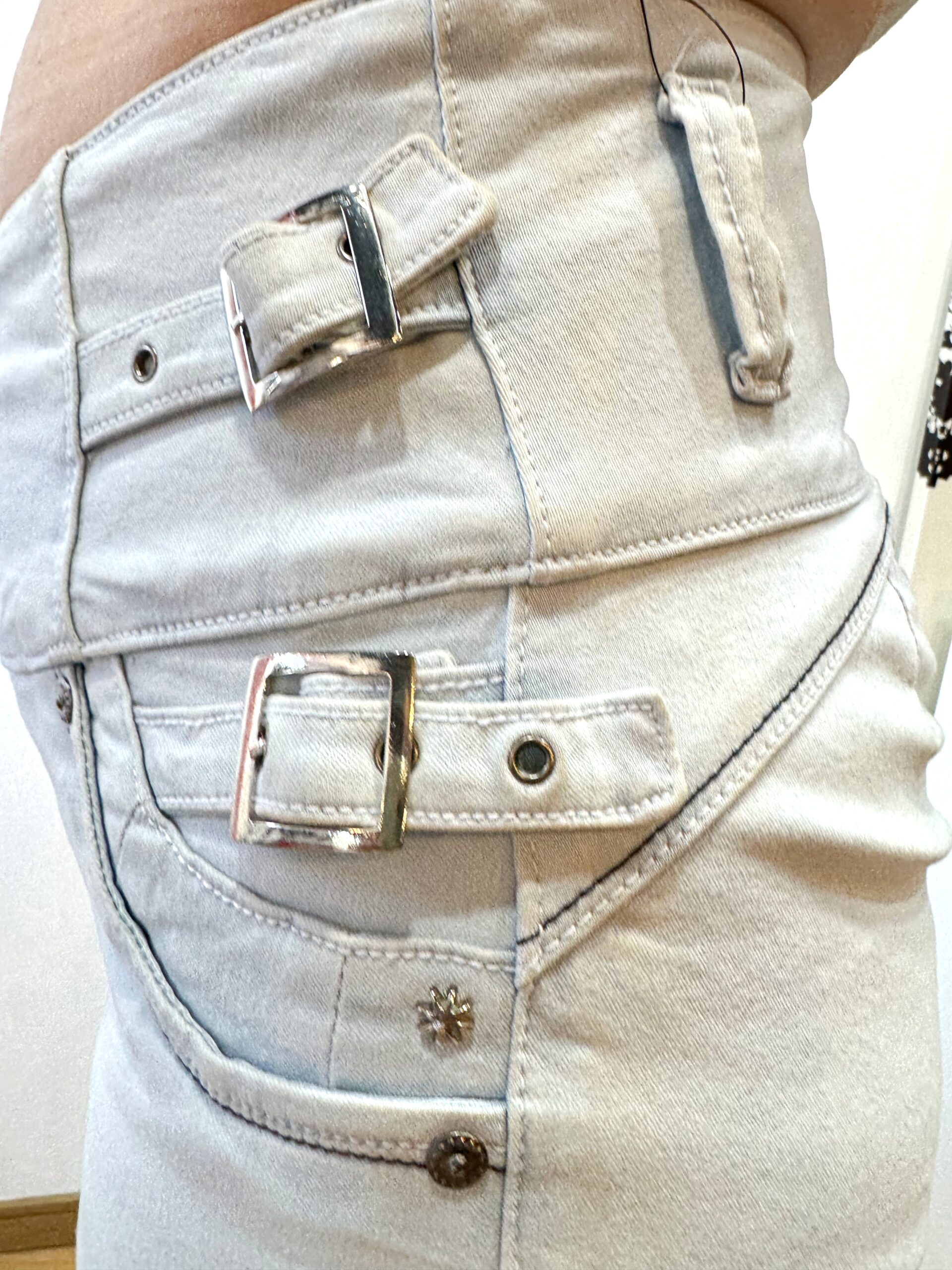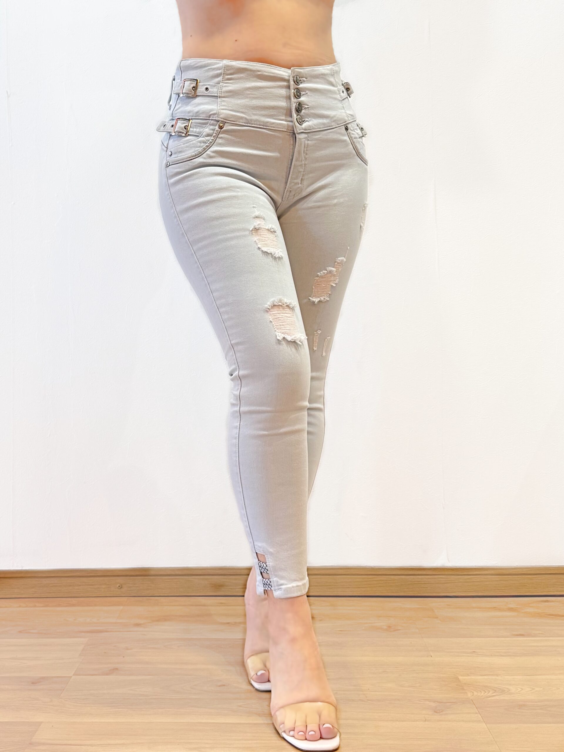 爽やかなスカイブルーカラーのアンクル丈スキニージーンズ。フロントの4つボタンがウエスト周りをしっかりサポートし、お腹を引き締めてすっきりとしたシルエットを演出します。ポケットなしのデザインでヒップラインを美しく強調し、プッシュアップ効果で女性らしい丸みのあるラインに。伸縮性のある生地で快適なフィット感を実現した一着です